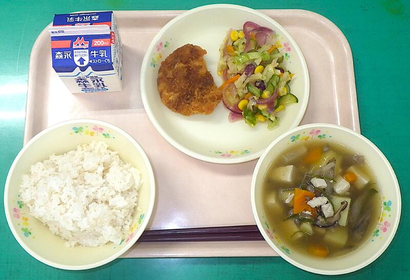 【6/19 本日の献立】ソースカツ・けんちん汁・紫タマネギのサラダ・麦ご飯・牛乳