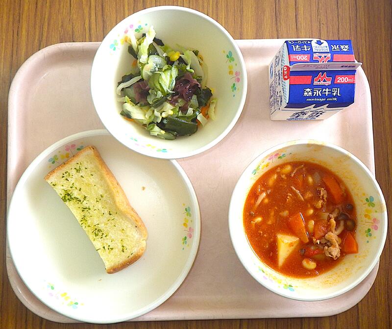 【6/20 本日の献立】ポークビーンズ・ガーリックトースト・海藻サラダ・牛乳