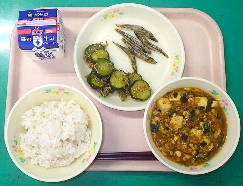 【6/26 本日の献立】カレー豆腐・きびなごのからあげ・カリカリきゅうり・麦ご飯・牛乳