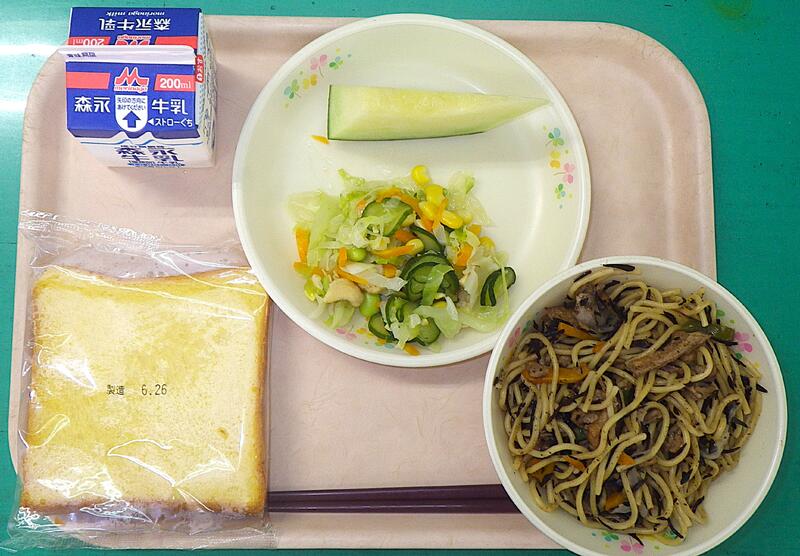 【6/27 本日の献立】ひじきスパゲテイ・にんじんパン・カシューナッツサラダ・メロン・牛乳