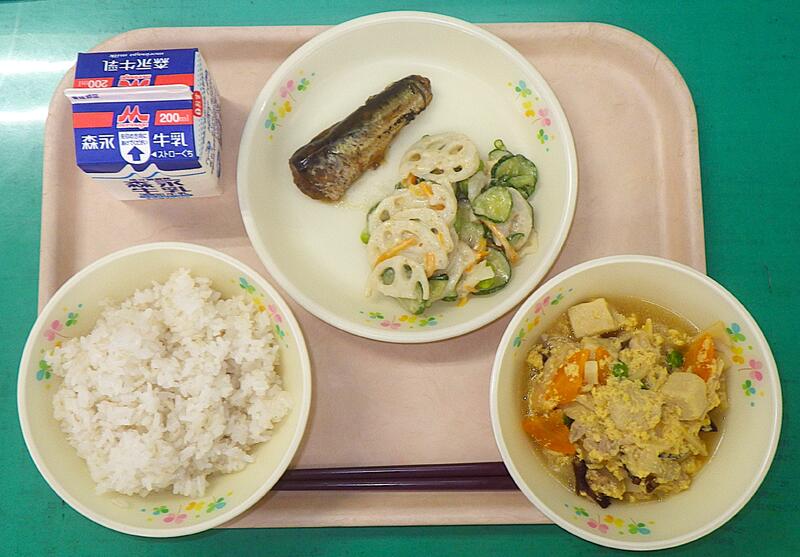【6/30 本日の献立】いわしの梅煮・高野豆腐の卵とじ・れんこんのみそマヨあえ・麦ご飯・牛乳
