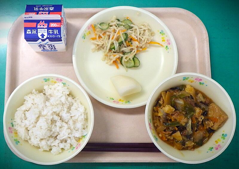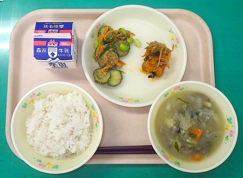 【7/17 本日の献立】チャプチェ・スーミータン・大豆と豆腐のフライ・麦ご飯・牛乳