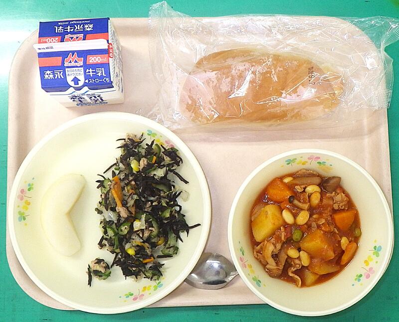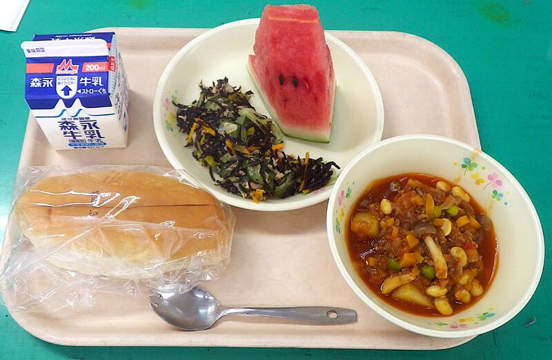 【7/4 本日の献立】チリコンカン・ひじきのマリネ・すいか・コッペパン・牛乳