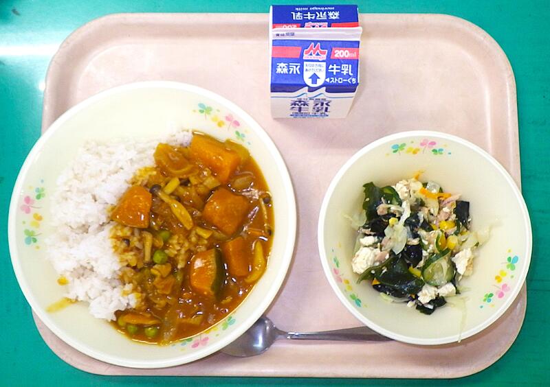 【8/28 本日の献立】かぼちゃのカレーライス・とうふサラダ・牛乳