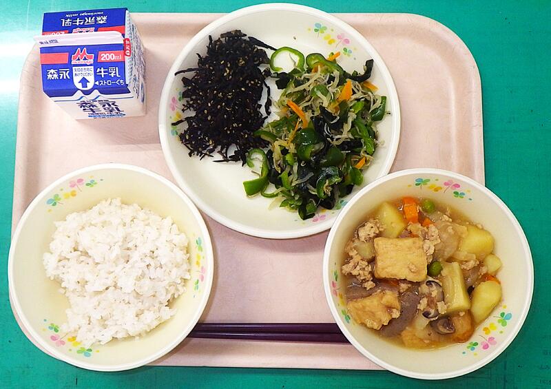 ◎麦ご飯にカレーじゃこふりかけ、どんどんご飯がすすみます。じゃがいものそぼろ煮には、がんもどきも入り、具だくさんでとても美味しかったです。もずくの酢の物には野菜も入って、栄養ばっちり!で美味しかったです。