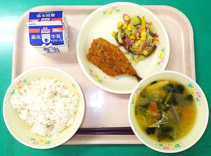 【9/2 本日の献立】いわしフライ・むらさき玉ねぎのサラダ・みそ汁・麦ご飯・牛乳