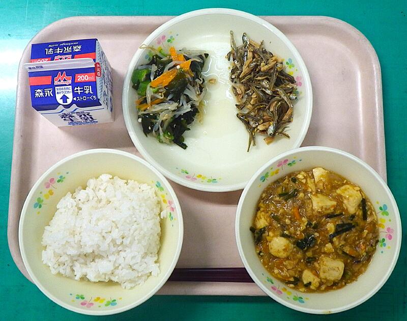 【9/4 本日の献立】マーボー豆腐・ナムル・いりこアーモンド・麦ご飯・牛乳