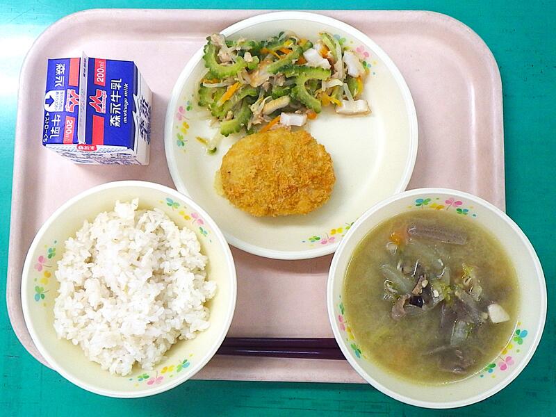 【9/9本日の献立】豚汁・ゴーヤのツナあえ・野菜コロッケ・麦ご飯・牛乳