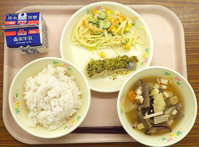 【9/11本日の献立】魚の香草焼き・つぼん汁・スパゲティサラダ・麦ご飯・牛乳