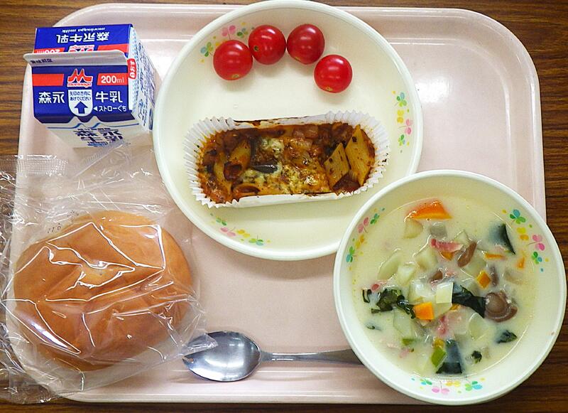 【9/12本日の献立】ナスのミートグラタン・チャウダー・ミニトマト・丸パン・牛乳