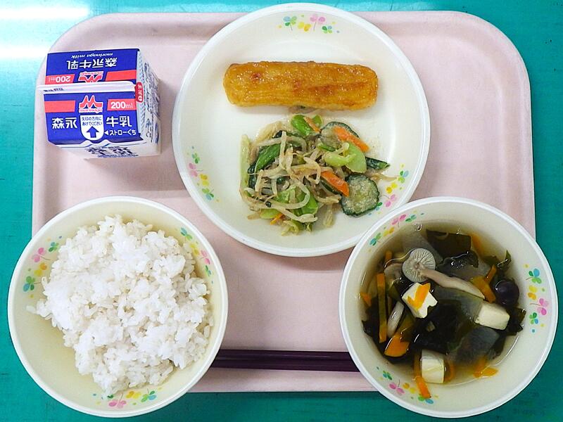 【6/23 本日の献立】手作りさつま揚げ・おかかあえ・麦ご飯・みそ汁・牛乳