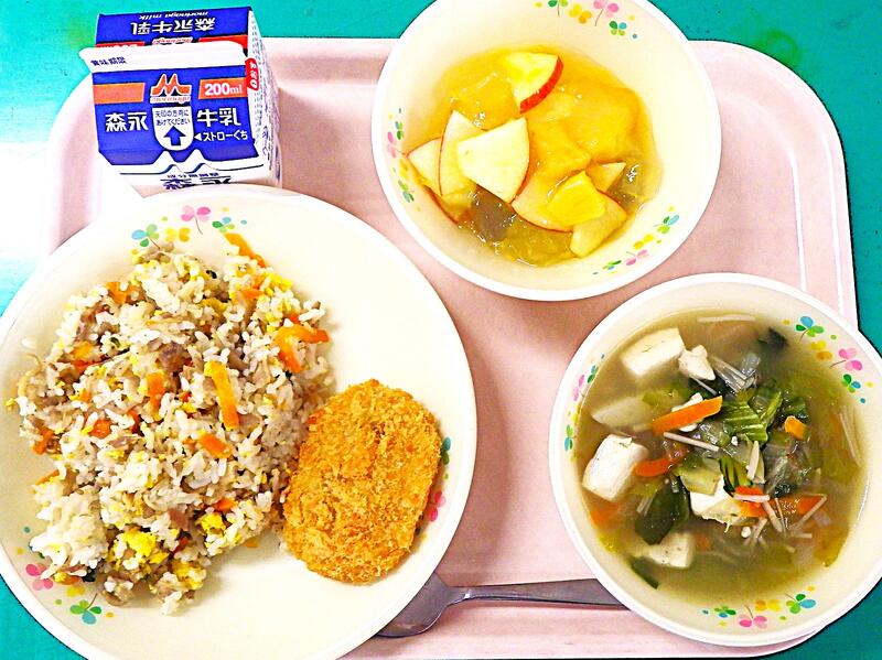 【3/17本日の献立】鶏ごぼうピラフ・野菜コロッケ・コンソメスープ・フルーツミックス・牛乳