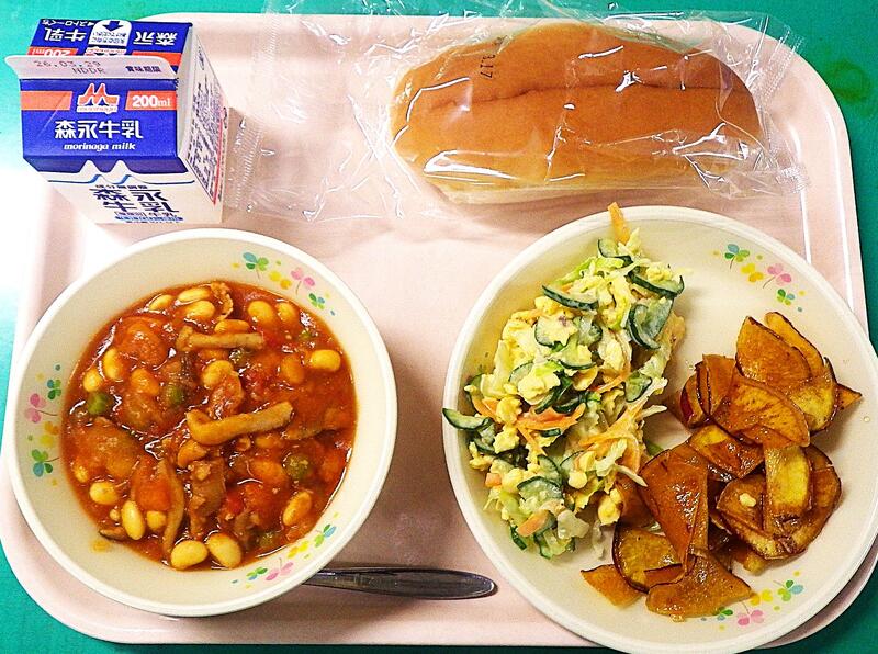 【3/18本日の献立】ポークビーンズ・セルフエッグサンド・サツマイモチップス・牛乳