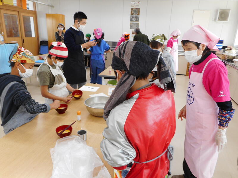 食生活改善員の方々の協力で、パッククッキング「ご飯・だし巻き卵・りんごの甘煮」を作りました。