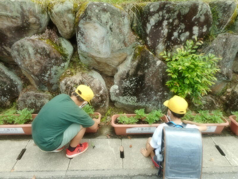 人権の花が花が咲いていることに気付いた2年生の子供たちは、「草を取った方がいい」と自主的に草ヒキをしてくれました。子供たちのやさしい心で、すくすく育っています。