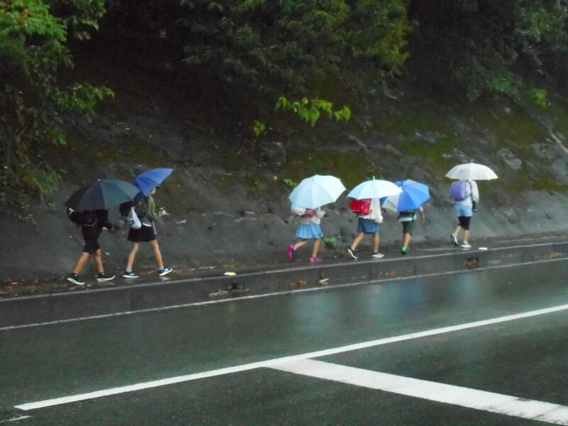 7日、朝からあいにくの雨。登校の様子を見てみると多くの子供たちが傘をさしてで一列で登校しています。