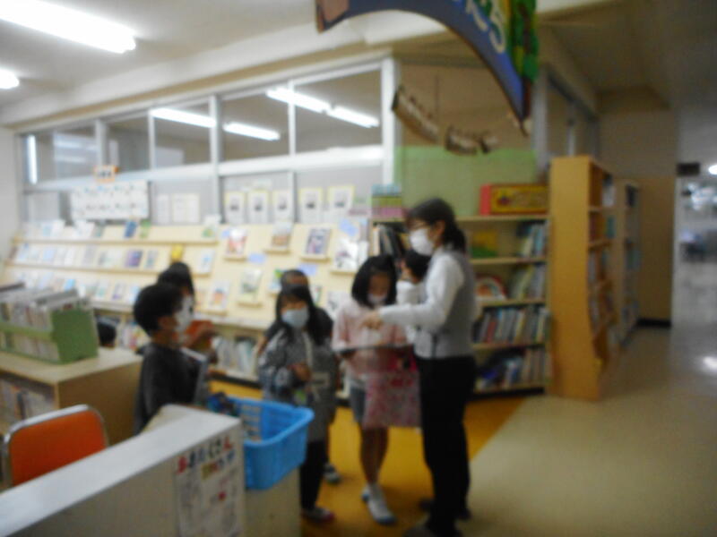今日、1年生は生活科で外で活動予定でしたが、雨のため読書をしました。まず、図書室で本を借りました。図書司書の中島先生にアドバイスいただきながら本を選びました。