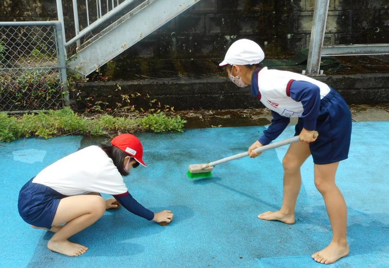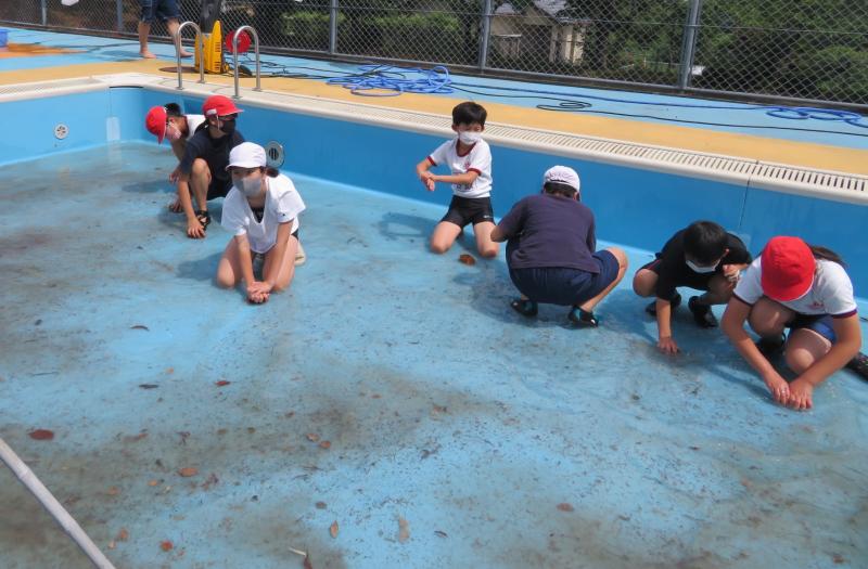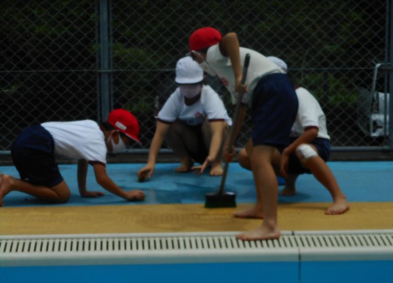 2,3時間目5,6年生がプール掃除をしました。暑い中、隅々までがんばって掃除をしてくれました。