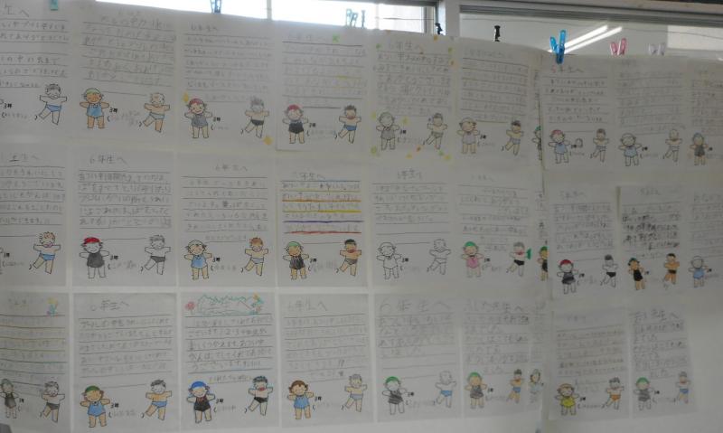それは、プール掃除をがんばった5,6年生にありがとうをつたえようという子どもたちの姿が見られています。