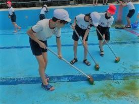 6月22日に、プール掃除を行いました。児童は、たわしやモップを使って、プールサイドやプールの中をピッカピカにしていました。みんなの頑張りで、安心して水泳授業を実施することができます。