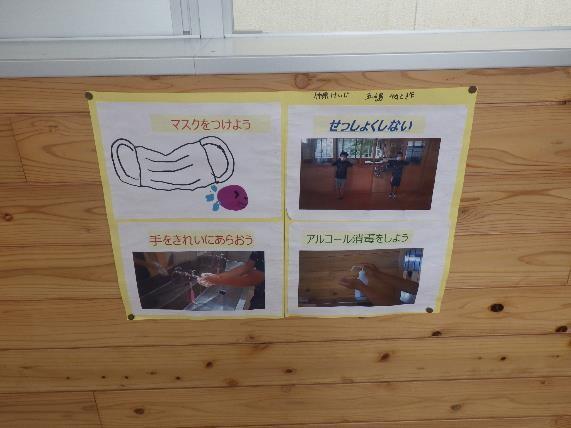 子どもたちが作った掲示物で、学校内での注意喚起につながっています。これからも「新しい生活様式」学校生活をおくります。