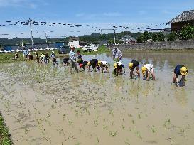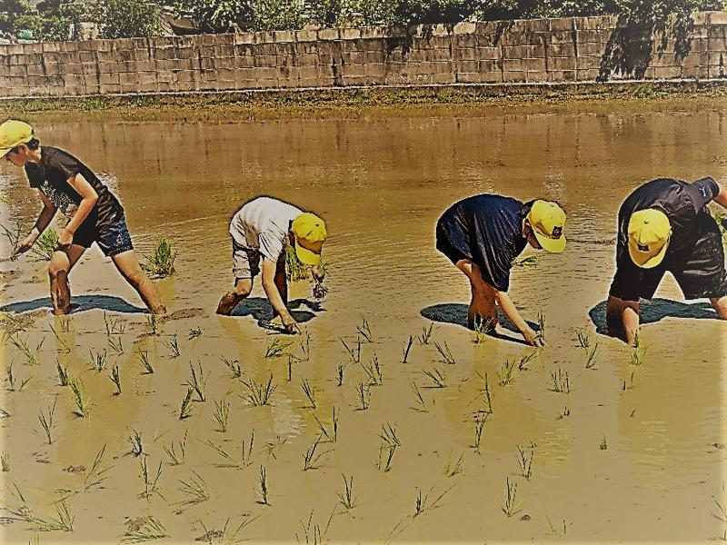 7月2日(木)に、5年生が田植えを行いました。天気が心配されましたが、絶好の田植え日和となりました。子どもたちも、初めは田んぼの感触にとまどっていましたが次第に慣れて、黙々と苗を植える姿が見られました。