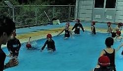 プール開きでは、各学年で「めあての発表」を行いました。「長いきょりをおよぎたい」「きれいなフォームで泳ぐ」「みんなで楽しみたい」等、自分なりの目標を立てていました。また、教師から「命を守ることの大切さ」「水泳の授業でのきまり」の指導を行いました。