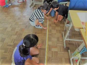 3年生の算数では、「長い長さをはかる」学習に取り組んでいます。今回は、昨年のスポーツテストで実施した「立ち幅跳びの長さ(紙テープで準備)」を、30cmものさしや巻き尺を使ってはかりました。「はかり名人」めざして、印をつけたり、巻き尺をピンと伸ばしたりグループで工夫して学習できました。最後に教室の長さをはかるときは、これまでの学習をいかして、子どもたちの目が更にきらきらしていました。
