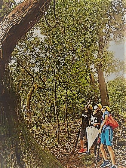 清水湧水池の大杉(樹齢700年)を見上げる様子