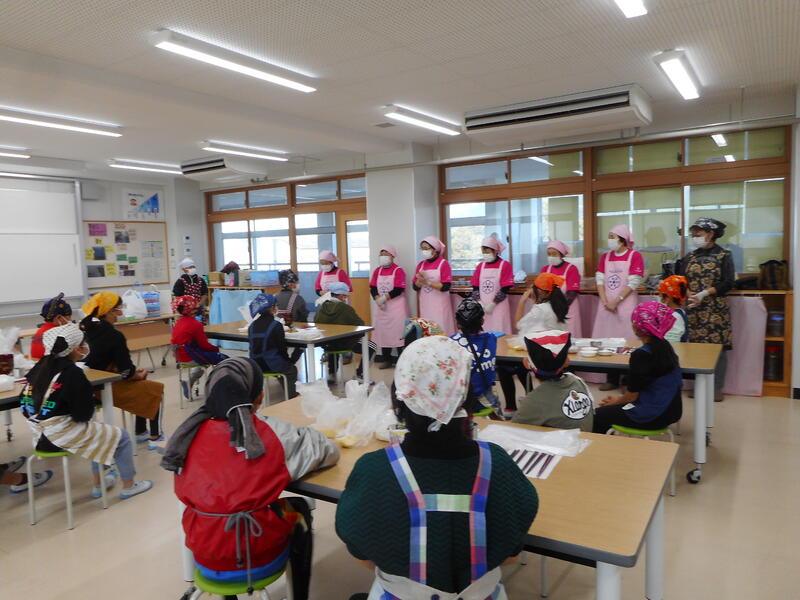 食生活改善員の方々の協力で、パッククッキング「ご飯・だし巻き卵・りんごの甘煮」を作りました。