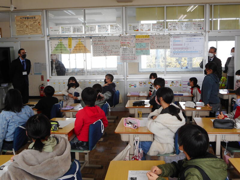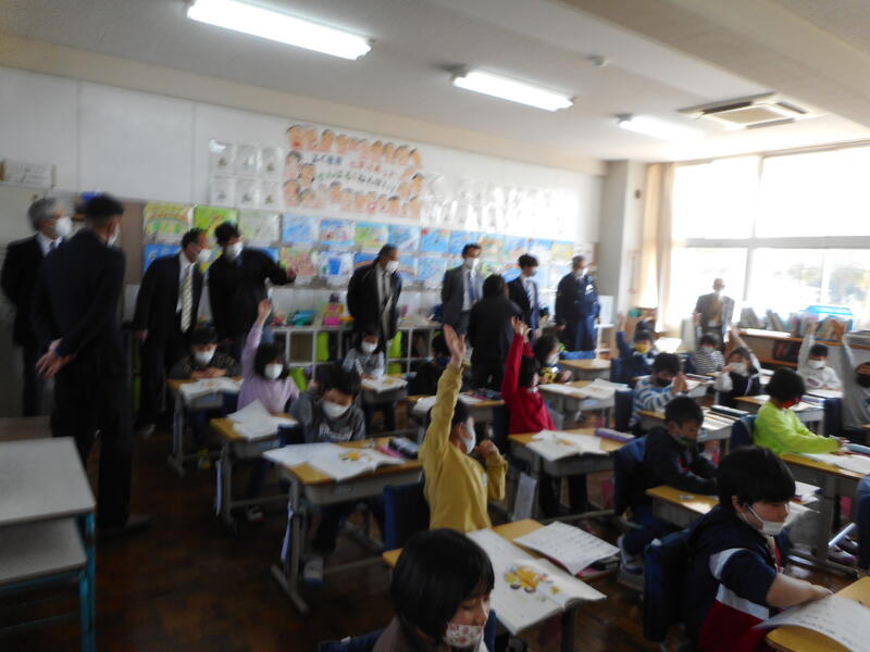 まず、1年生から6年生までの授業を参観しました。授業を参観されて、子供たちがとても落ち着いているというお話をいただきました。また、「挨拶もいいですね」ということで、子供たちのがんばりをたくさんほめていただきました。