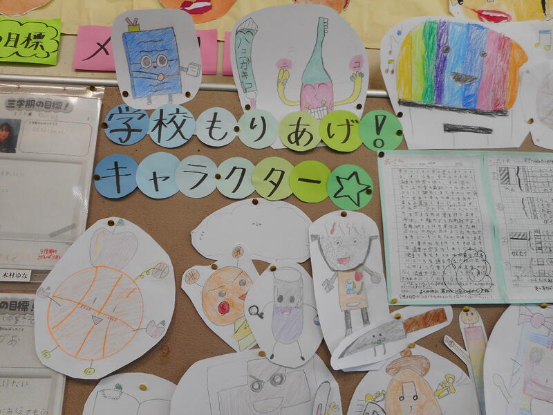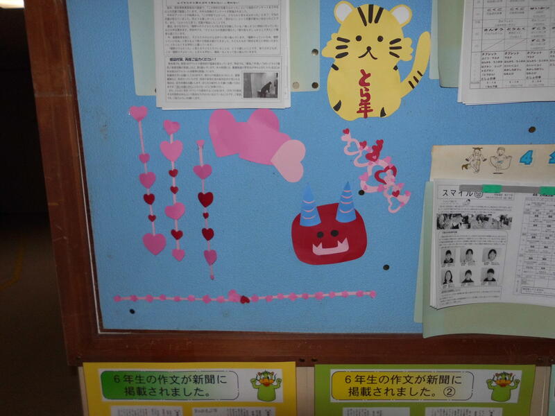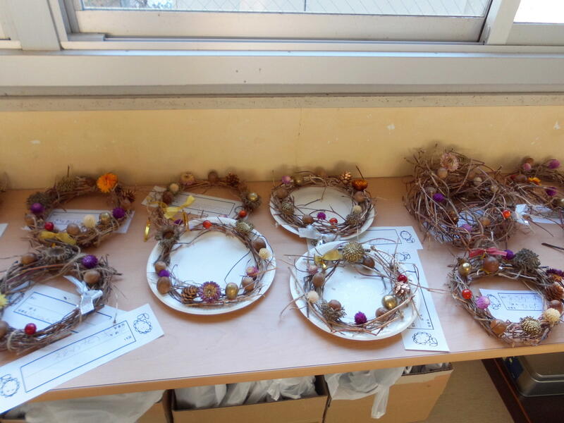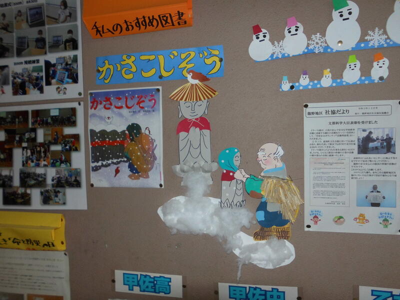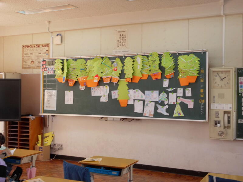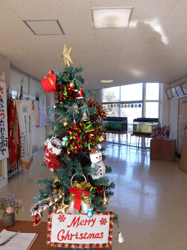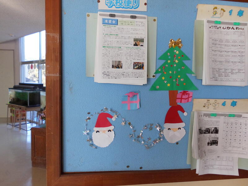 玄関が入るとクリスマスツリー、掲示があります。1年教室、2年生教室には子どもたちの作ったクリスマスの飾りがあります。