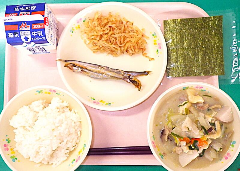 【1/19本日の献立】団子汁・焼きシシャモ・たくあん・セルフおにぎり・牛乳
