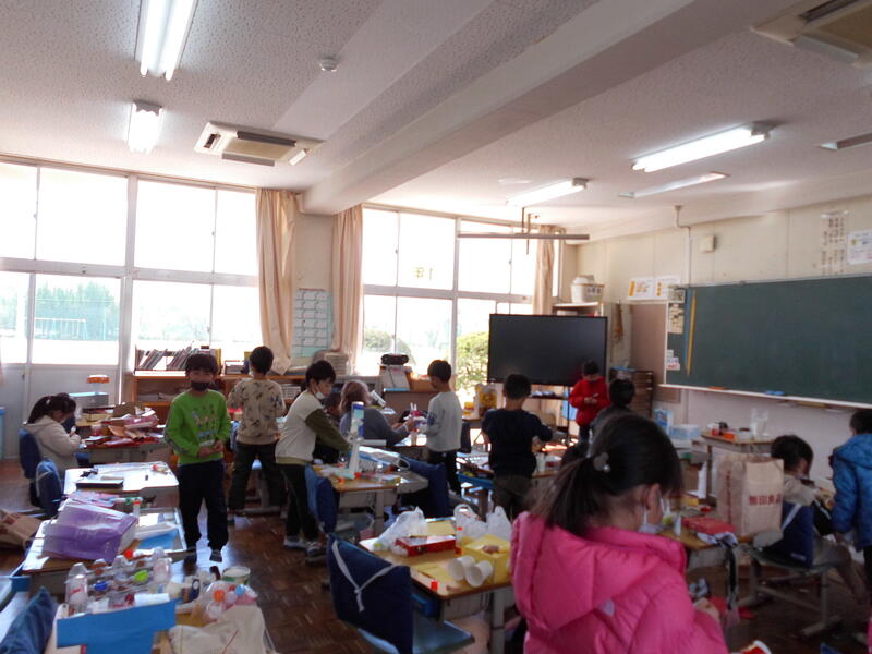 1年生は、自分で集めた空き箱やカップなどを使って作りたいものを作っています。