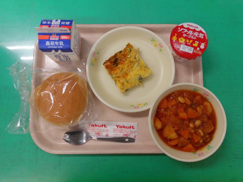 【12/17本日の献立】ミートボールと豆のトマト煮・ほうれん草のキッシュ・米粉パン・ヨーグルト・牛乳