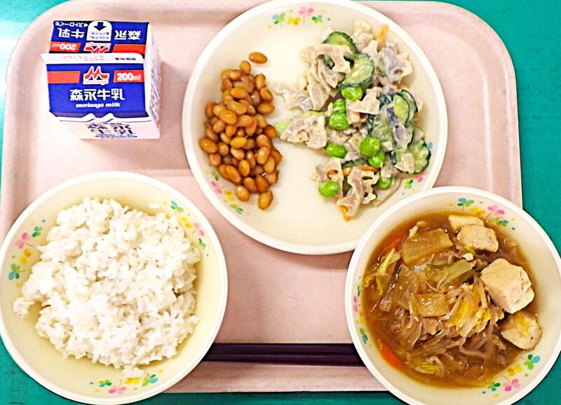 【12/18本日の献立】肉豆腐・れんこんのカレーマヨあえ・ざぜん豆・麦ごはん・牛乳