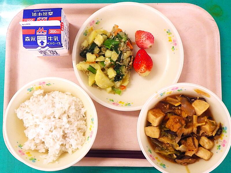 【2/12本日の献立】ジャーチャン豆腐・じゃこじゃがサラダ・いちご・むぎごはん・牛乳
