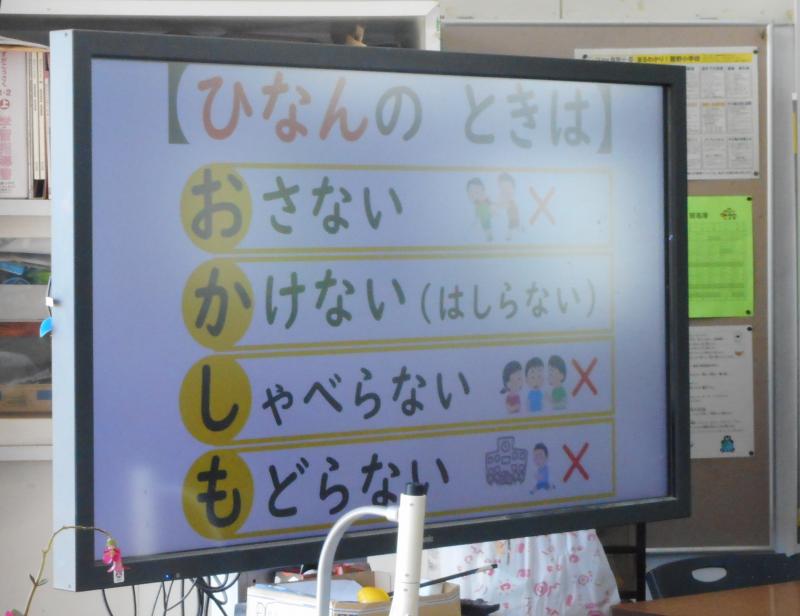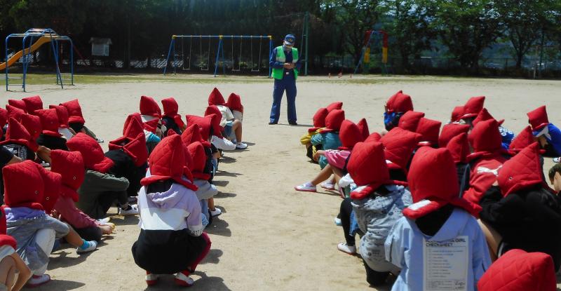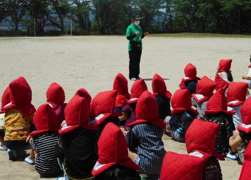 避難訓練には、防災士の市下さんとくらしと安全推進室の佐々木室長が来ていただき、「自分の命は自分で守ること」「災害はいつ起こるかわからない。しっかり考えておくことが大切」など教えていただきました。お二人から、子どもたちの訓練の様子はとても立派だったとほめていただきました。