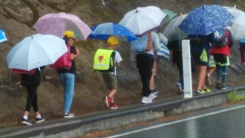 交通量が増えても、子どもたちが安全に登校できるように見守ってくださる地域の方がいます。この雨の中、多くの方が子どもたちのために交通指導をしてくださっていました。また、一緒に歩いて登校してくださる方もいます。