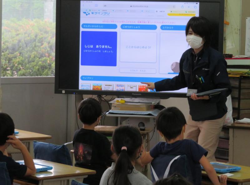 12日は1年生が初めてタブレットに挑戦しました。ICT支援員の方にも協力していただき、電源を入れ、「e-ライブラリー」に取り組みました。子どもたちは、画面が変わったり問題が正解したりするたびに喜んでいました。とても充実した1時間になりました。