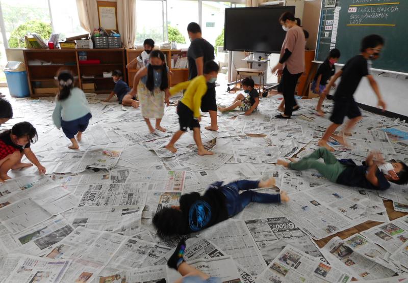 これは、新聞を丸めたり破いたり引っ張ったり、広げたりしながら造形遊びをする学習です。