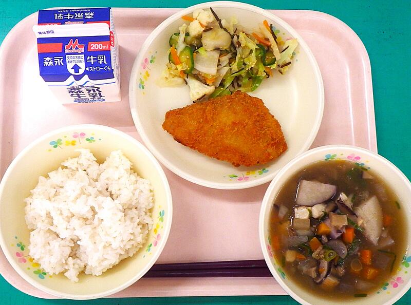【12/9本日の献立】ぶりフライ・豚汁・甘酢あえ・麦ごはん・牛乳