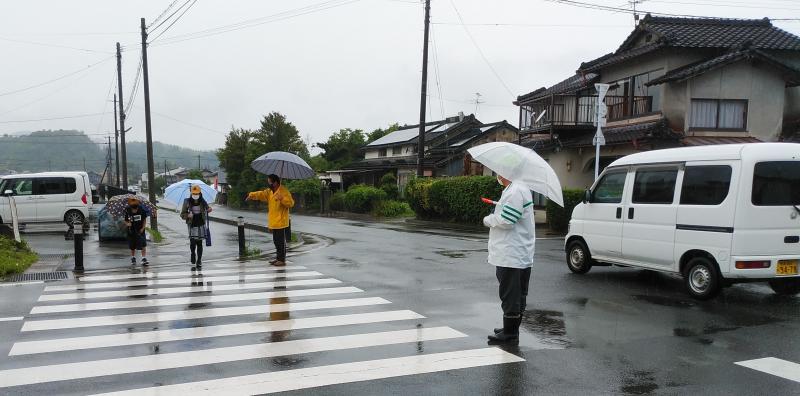 交通量が増えても、子どもたちが安全に登校できるように見守ってくださる地域の方がいます。この雨の中、多くの方が子どもたちのために交通指導をしてくださっていました。また、一緒に歩いて登校してくださる方もいます。