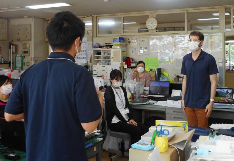 職員室では、外国語活動担当の岩永先生が、英語でお礼の言葉を述べましたサングスター先生、5年間本当にありがとうございました。