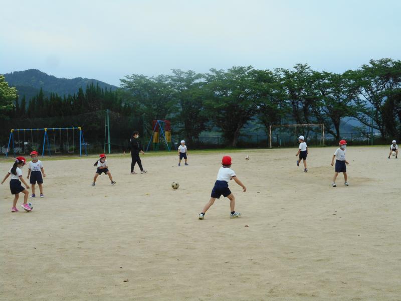 2年生は体育の時間にサッカーをしています。パスをしたりボールを止めたりと基本の練習からチームでの練習などみんなで協力しながらがんばる姿が見られました。