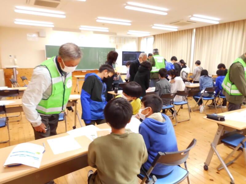 くらし安全室の永井室長、校区の防災士、区長、民生児童委員の方々に参加いただき子供たちといっしょに考えていただきました。