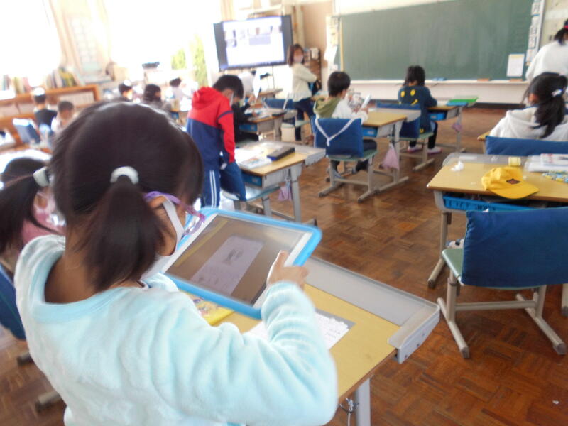 1年生が生活科でまとめた用紙をタブレットで写真にとり先生に提出できるようになっています。そこで、授業の中で友達が考えた考えをみんなで確認できるようになっています。子供たちはさすがです。