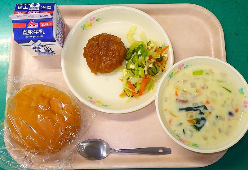 【4/15本日の献立】ハンバーグ・クラムチャウダー・アスパラサラダ・パン・牛乳