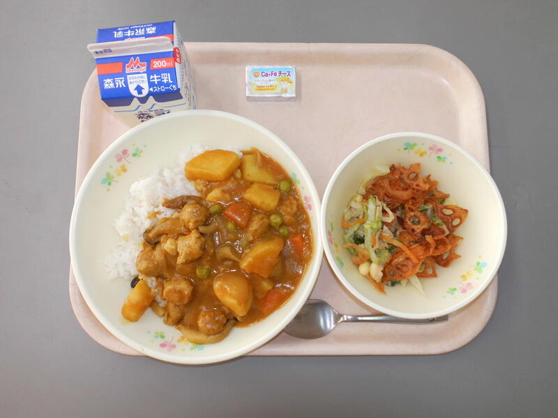 【12/10本日の献立】ミートボールカレーライス・レンコンチップスサラダ・チーズ・牛乳