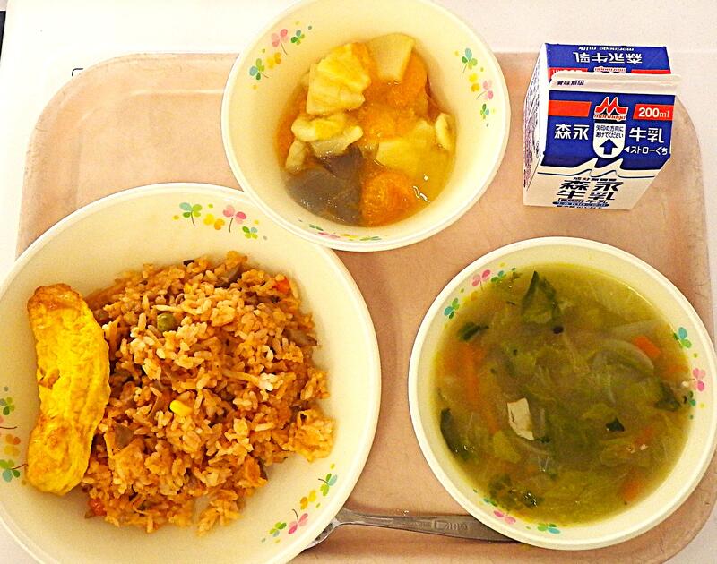 【4/10本日の献立】チキンライス・オムレツ・コンソメスープ・フルーツミックス・牛乳